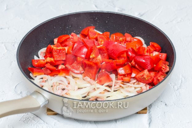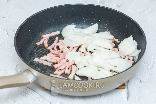 В эту же сковороду выложите нарезанные бекон и лук. Как нарезать бекон и лук - дело исключительно ваших предпочтений.