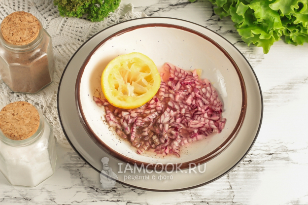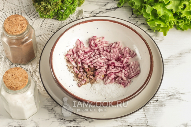 Очистите луковицу от кожуры и промойте. Нарежьте мелким кубиком и всыпьте в пиалу или креманку, соусник. Добавьте соль и молотый черный перец. Можно всыпать немного молотых итальянских или французских трав.