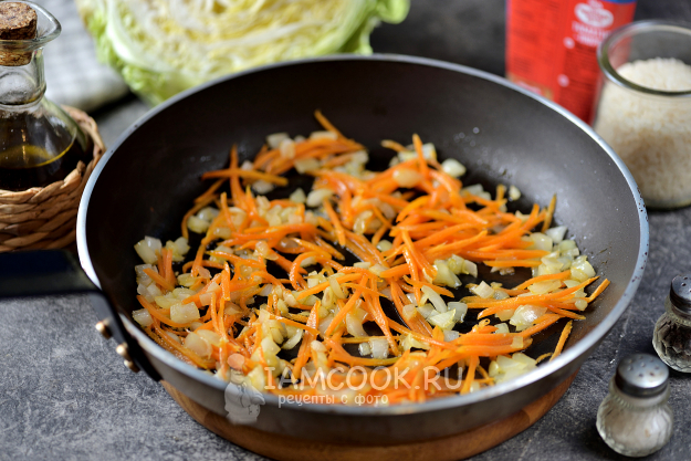 Разогрейте в сковороде растительное масло, выложите в него нарезанный кубиком репчатый лук и тонко нашинкованную морковь, обжарьте минуты 3 до мягкости.