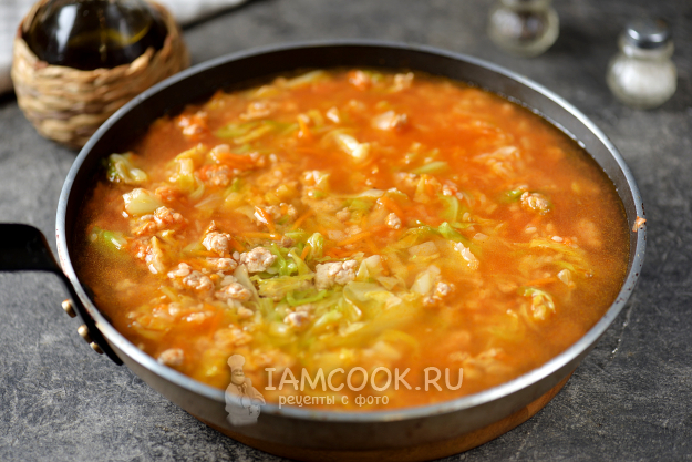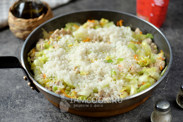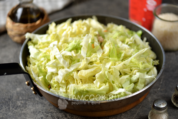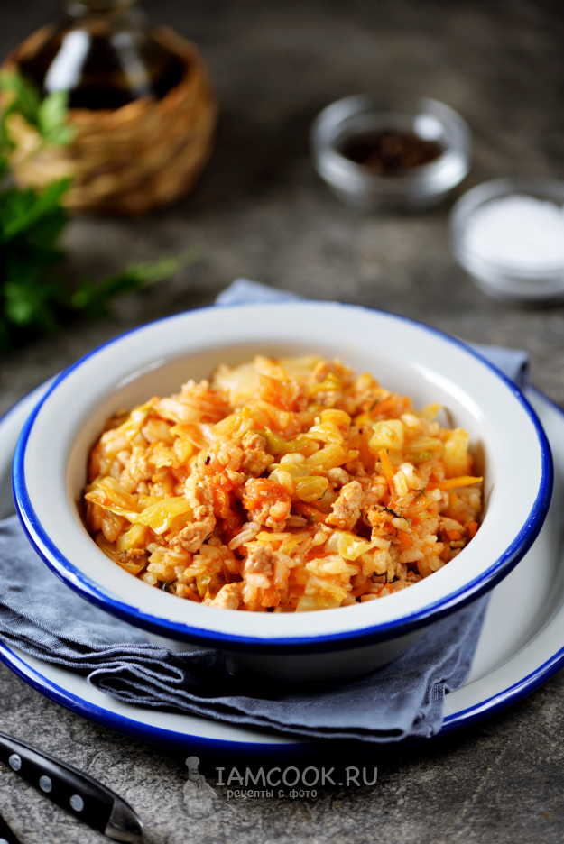 Теперь влейте столько холодной воды, чтобы она была выше содержимого сковороды чуть меньше, чем на сантиметр. После закипания прикройте сковороду крышкой, готовьте ленивые голубцы на тихом огне 20 минут, этого времени вполне достаточно, чтобы рис полностью приготовился и индюшиная лопатка хорошо протушилась. Спустя время выключите плиту, отодвиньте сковороду с горячей конфорки и оставьте еще минут на 10 под плотно закрытой крышкой, нужно дать рису максимально набухнуть и пропитаться всеми вкусами.