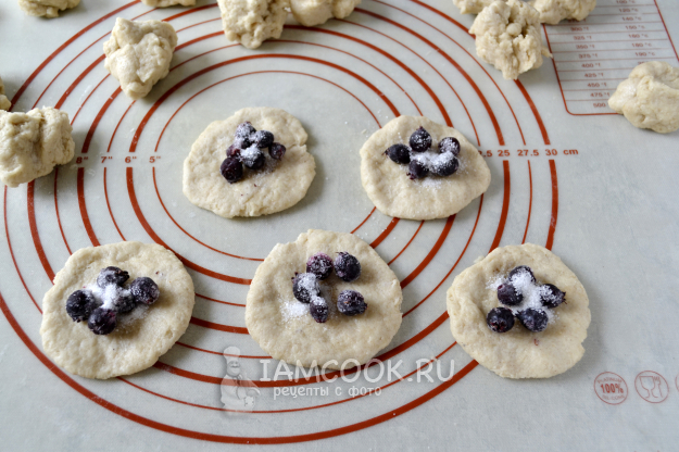 Сначала скатайте кусочек теста в шарик, затем расплющите его руками в тонкую лепешку. Положите в центр несколько ягод ирги, щепотку сахара. Ягоды можно полностью не размораживать.