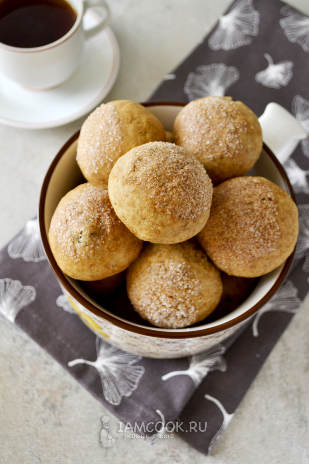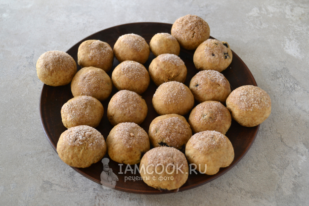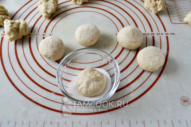 Соедините края лепешки вместе, скатайте колобок. Обмакните каждый колобок одной стороной в сахар.