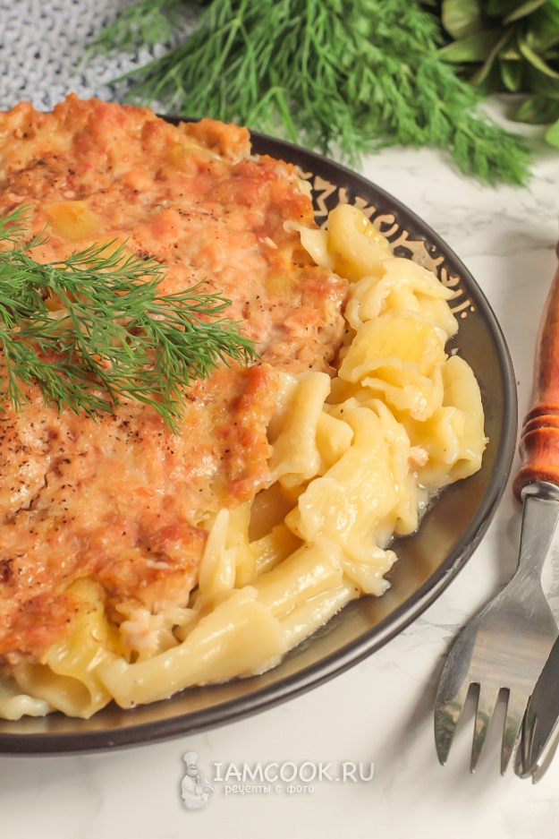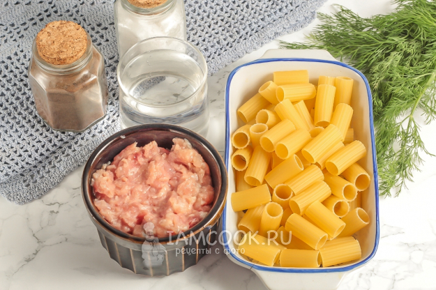 Продукты для приготовления макарон с куриным фаршем в духовке - перед вами!