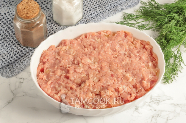 Посолите и поперчите куриный фарш. Можно добавить и другие специи, приправы или пряности по вашему вкусу. Влейте горячую воду в форму, чтобы она слегка покрыла куриный фарш. Разогрейте духовку до 180 градусов.