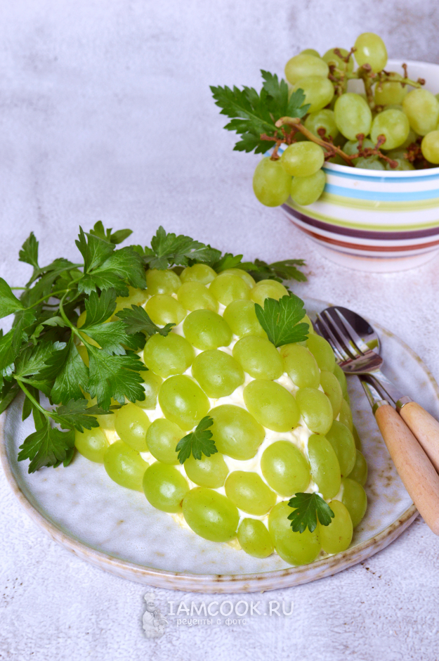 Салат «Виноградная гроздь» с копченой курицей готов к подаче на стол. Приятного аппетита!