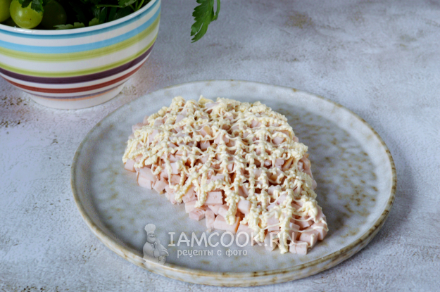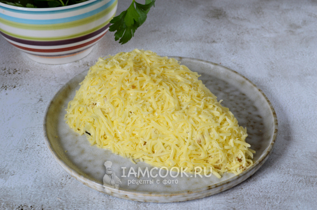 Далее - сыр, натертый на мелкой терке, смазать майонезом.