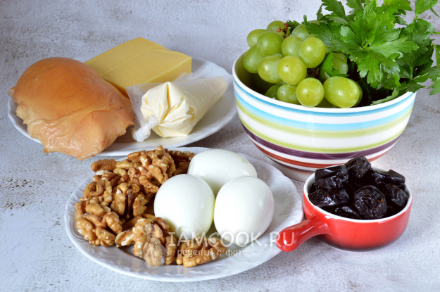 Соберите необходимые ингредиенты для приготовления салата «Виноградная гроздь» с копченой курицей.