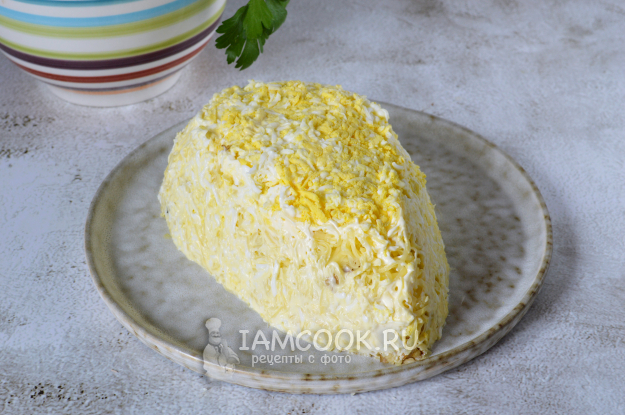 Завершающий слой - яйца, натертые на мелкой терке, и майонез.