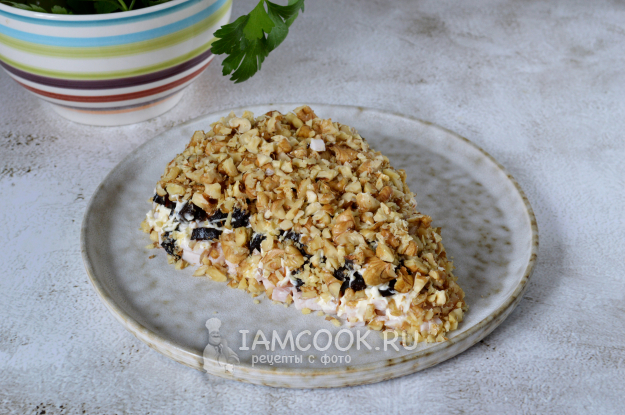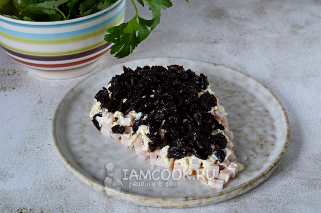 Чернослив нарезать мелким кубиком и выложить вторым слоем, смазать майонезом.