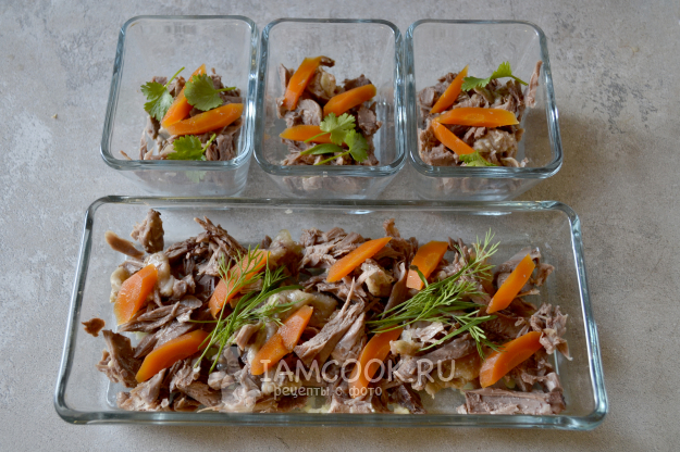 Куриное мясо отделите от костей, разберите мясо на волокна или нарежьте мелкими кусочками, положите в формы для холодца.