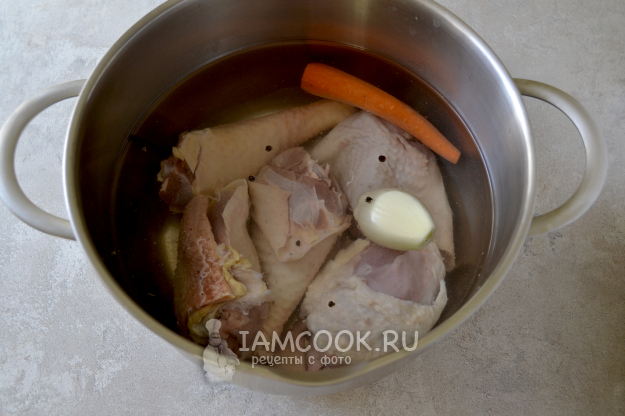 Сложите разрезанные окорочка в кастрюлю, положите морковку, луковицу, перец горошком, залейте воду и поставьте кастрюлю на огонь.