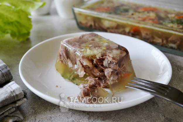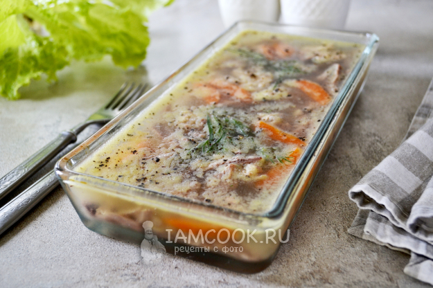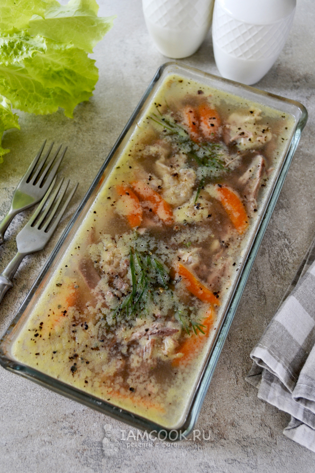 Примерно через 3 часа холодец из куриных окорочков с желатином хорошо застыл и готов к подаче.