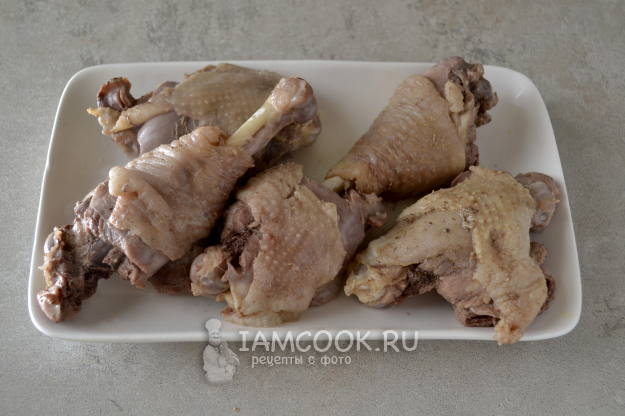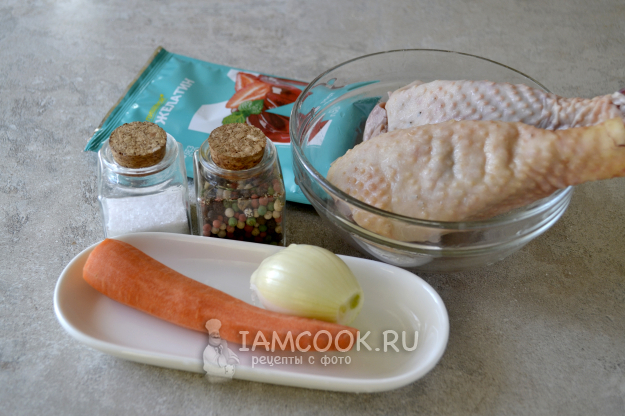 Соберите ингредиенты для приготовления холодца из куриных окорочков с желатином.
