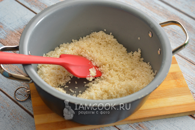 Всыпьте промытый и обсушенный рис и обжарьте его до прозрачности.