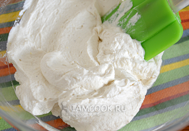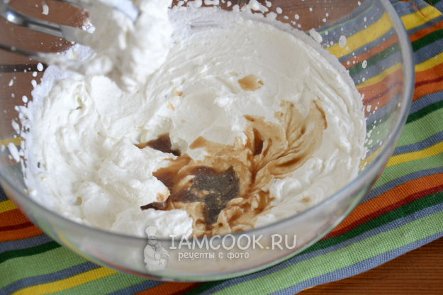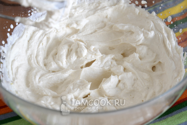 Взбить сливки с сахарной пудрой. Если не уверены в качестве сливок, то сахарную пудру стоит добавлять постепенно.