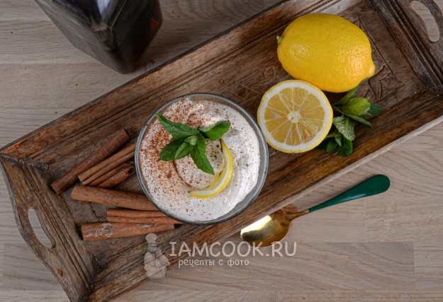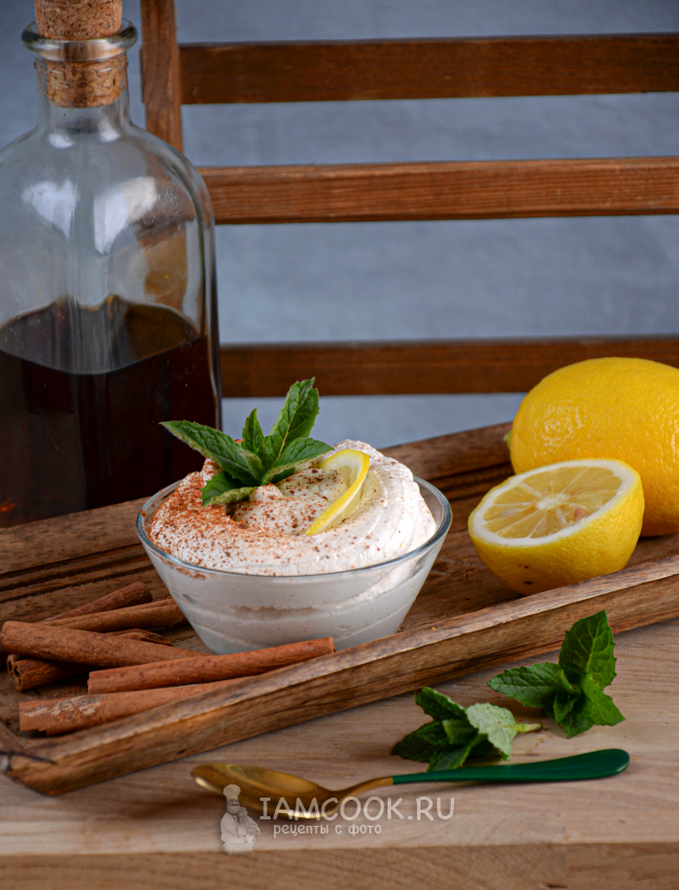 Подаем лимонный Силлабаб с тонким слайсом лимона, веточкой мяты и корицей.