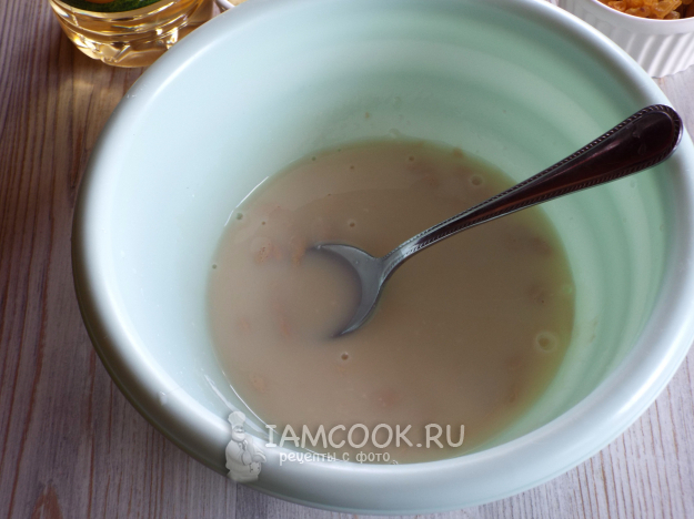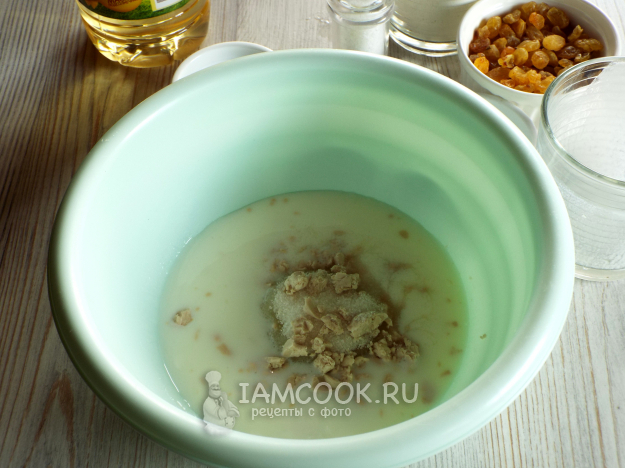 Кефир немного подогреть. Растворить в нём дрожжи и сахар.