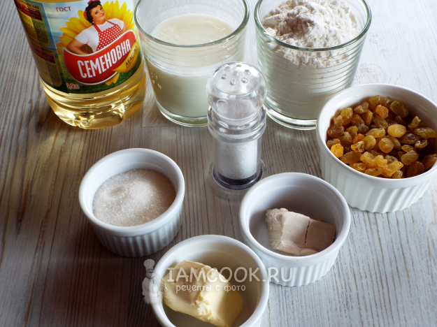 Булочки с изюмом из теста как пух будем готовить из такого набора продуктов.