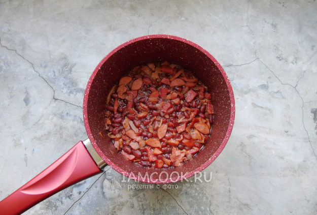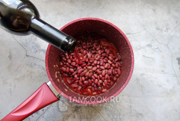 Накройте кастрюлю крышкой и тушите фасоль с копченостями и вином 10 минут на небольшом огне.