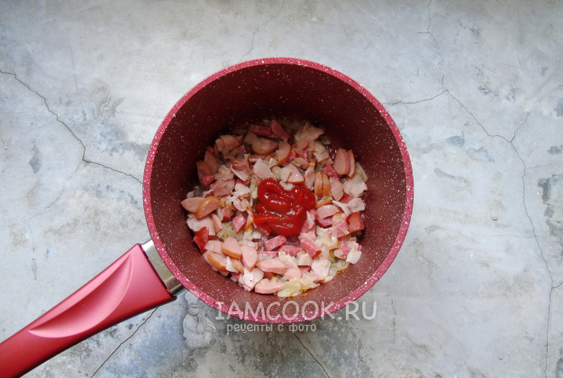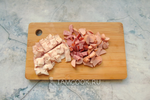 Мясные продукты нарежьте. Подойдут любые копчености, обрезки копченых ребер, сосиски, колбасы.