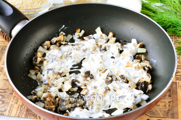 Налейте немного растительного масла на сковороду, разогрейте, всыпьте туда грибы с луком, обжаривайте 3-4 минуты. Посолите и поперчите по вкусу, затем добавьте сметану и томите начинку на медленном огне еще 5-7 минут. Готовую начинку полностью остудите.