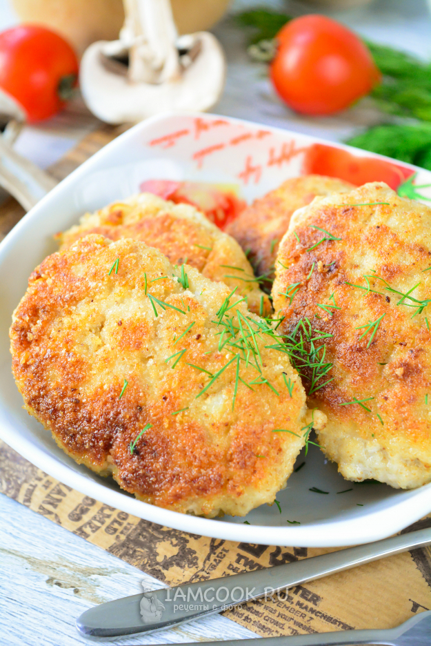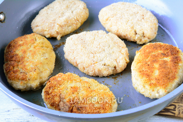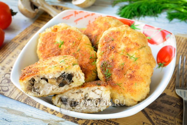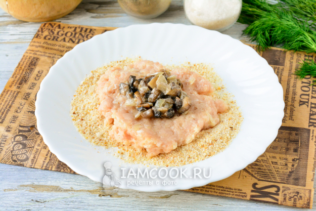 Руки смочите в воде, выложите немного фарша на ладошку, приплюсните его и в центр выложите 1-1,5 ч.л. грибной начинки. Защипните края котлеты и положите в панировочные сухари.