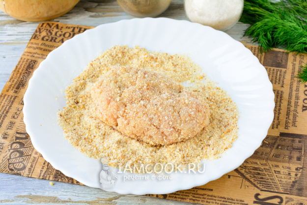 Запанируйте зразы в сухарях. Таким образом слепите все мясные зразы с грибами.