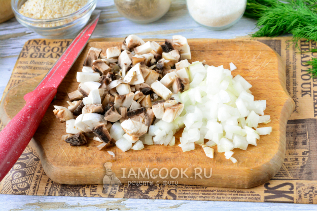Сперва приготовьте начинку. Почистите и сполосните шампиньоны, нарежьте грибы небольшими кубиками. Так же поступите и с репчатым луком - нарежьте его мелкими кубиками.