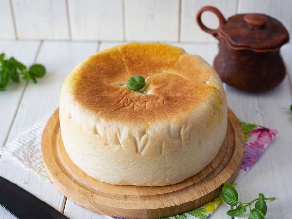 Накройте сковороду крышкой и готовьте пирог на самом минимальном огне 20 минут. После снимите крышку, накройте пирог тарелкой подходящего диаметра и переверните на неё пирог. Затем, аккуратно помогая лопаткой, переложите пирог на сковороду сырой стороной.
