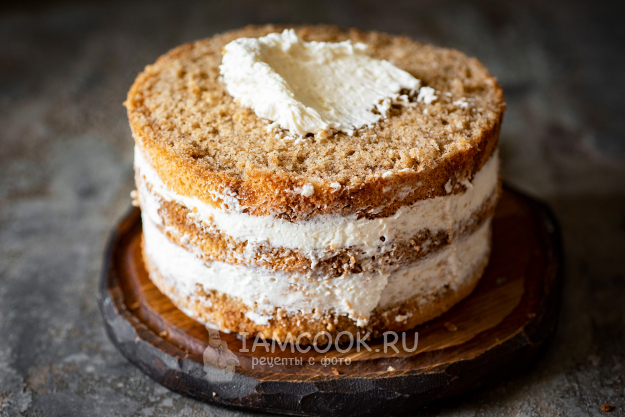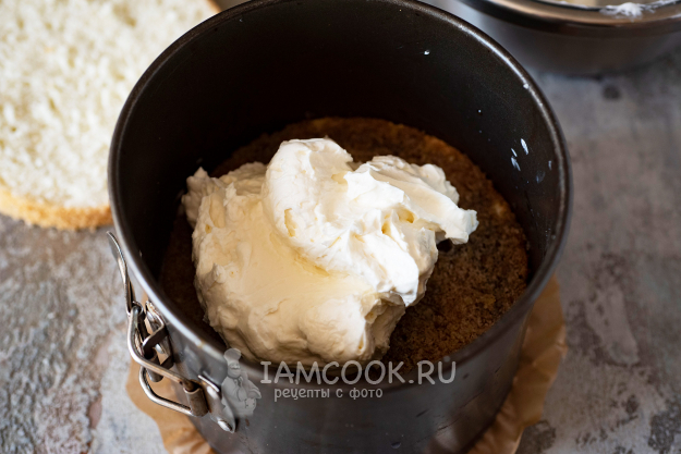 Поверх коржа распределим примерно 150-180 г крема из рикотты. Поверх выложим следующий корж, затем пропитаем его, и вновь слой крема, который накроем третьим коржом, тоже пропитаем его. В таком виде заполненную форму поместим в холодильник на 2-3 часа.