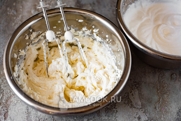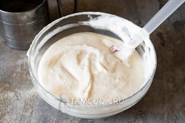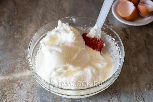 Белковую массу добавим к желтковой смеси. Лопаткой очень аккуратными, медленными движениями вмешаем одну смесь в другую, сохраняя воздушность.
