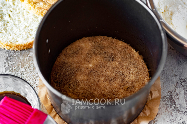 Приступим к сборке тортика. На дно формы выложим пергамент для выпечки, сверху уложим первый бисквитный корж, пропитаем его с помощью силиконовой кисти приготовленной кофейной пропиткой.