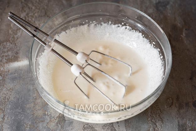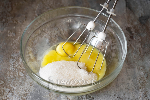 Миксером будем взбивать желтки с сахаром до белого цвета смеси.
