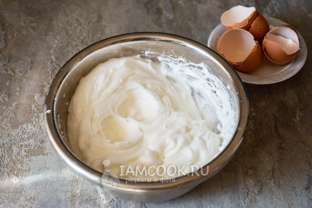 Белки со щепоткой соли будем взбивать миксером в чистой сухой миске до устойчивых пиков.