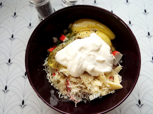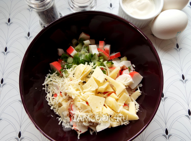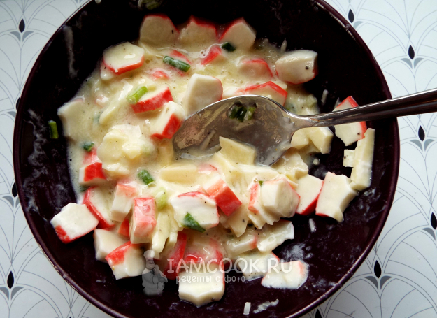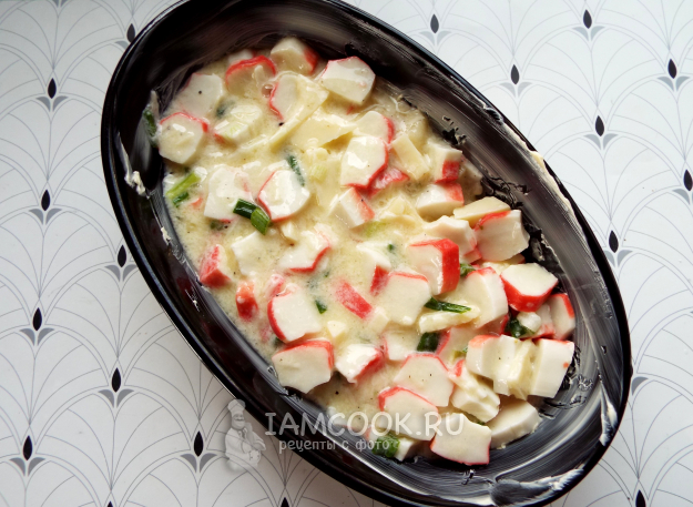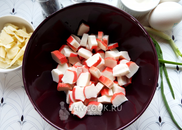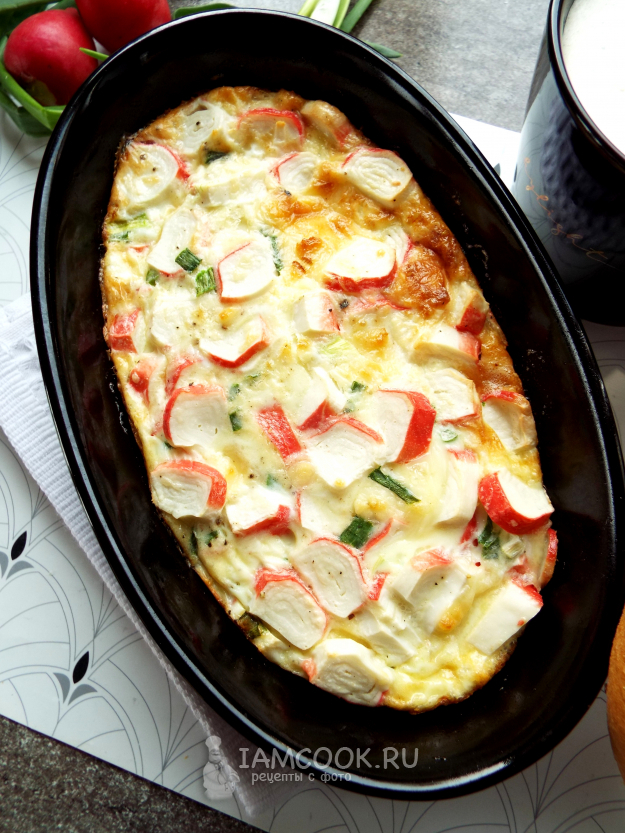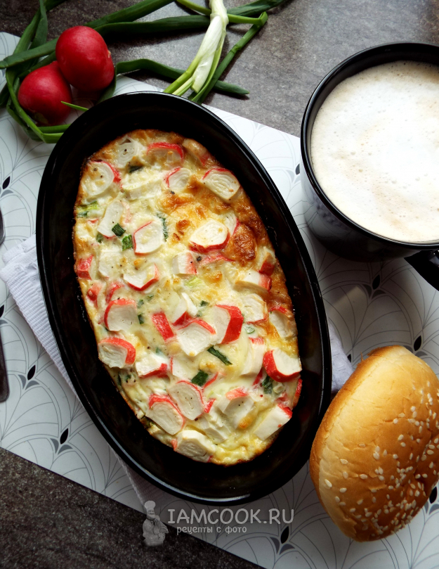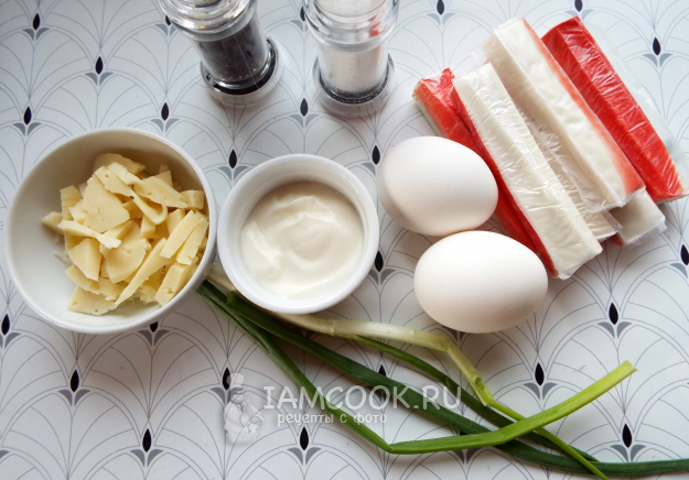 Чтобы приготовить запеканку с крабовыми палочками, возьмите необходимые ингредиенты по списку.
