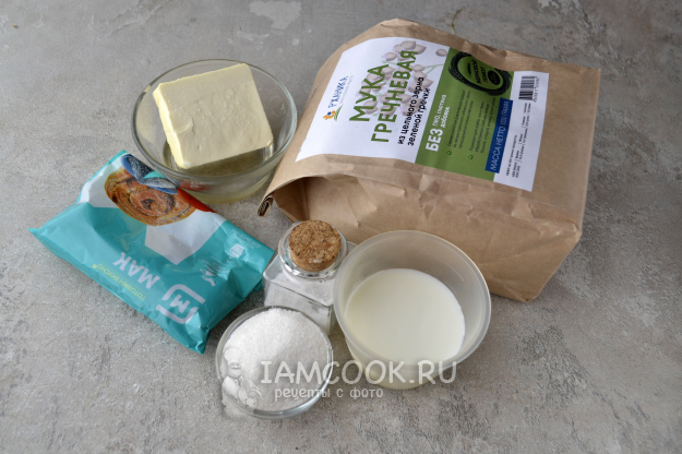 В миску просейте муку зеленой гречки, добавьте сахар (2 ст.л.), соль и мягкое сливочное масло.