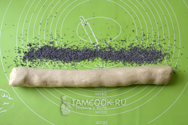 Разделите тесто на две части. Половину печенье я сделаю с маком, а вторую половину - с сахаром. Скатайте на силиконовом коврике из теста валик. Насыпьте на коврик мак. Покатайте валик теста по маку, чтобы тесто было покрыто маком со всех сторон.