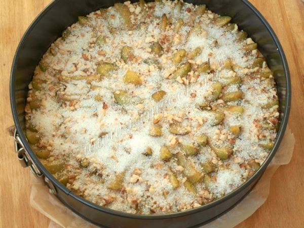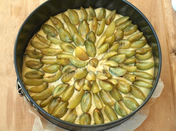 Взять разъёмную форму, застелить пекарской бумагой, вылить тесто и разровнять. Сверху выложить нарезанные кусочки слив в форме цветка, начиная от края к центру.
