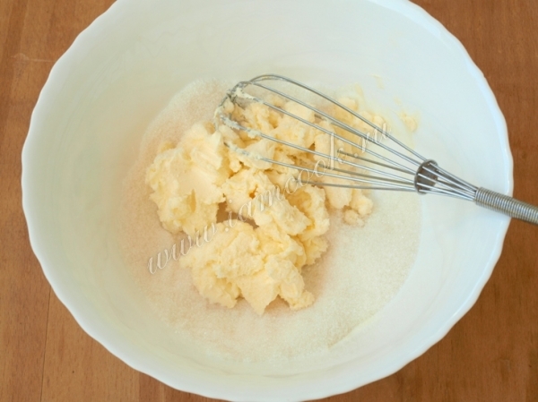 Масло должно быть мягким, поэтому его следует достать заранее из холодильника. Взбить мягкое масло с сахаром при помощи венчика.