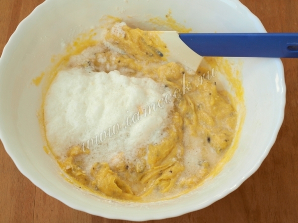 Отделить желтки от белков. Желтки добавить в сахарно-масляную смесь и размешать.