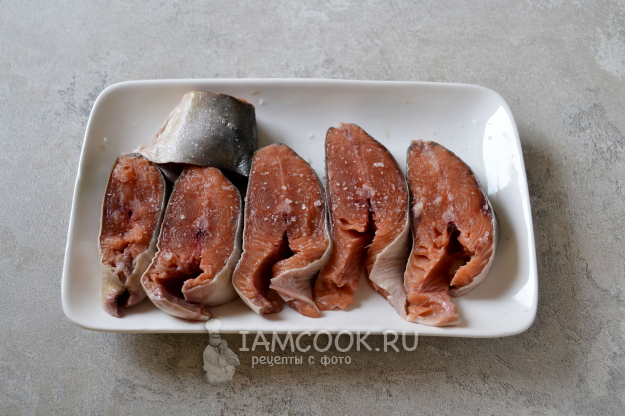 Горбушу нарежьте на стейки толщиной 1,5-2 см. Посыпьте солью с обеих сторон.