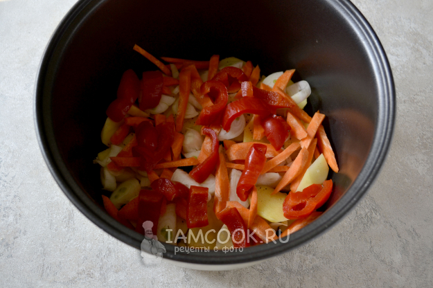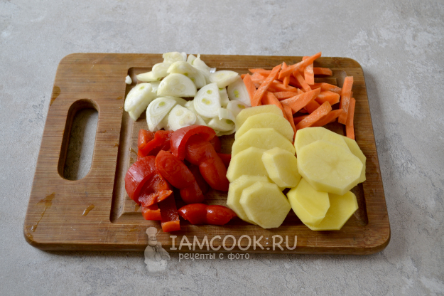 Картофель нарежьте кружочками, болгарский перец - толстой соломкой, морковь - соломкой, лук - полукольцами.
