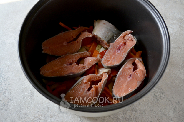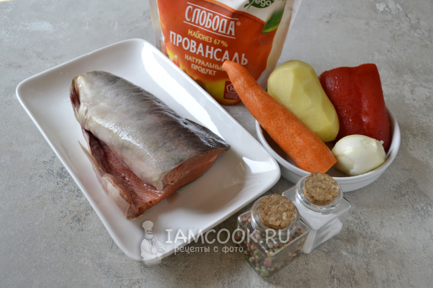 Соберите продукты для приготовления горбуши с овощами в мультиварке.