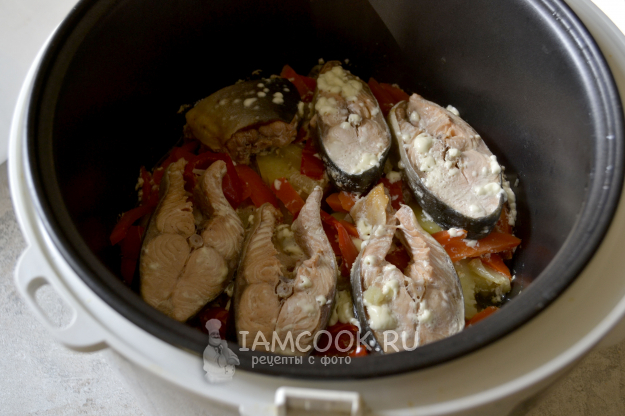 Полейте этим разведенным майонезом продукты в чаше. Поставьте чашу в мультиварку, закройте крышку, выставьте программу "Тушение". Готовьте горбушу с овощами в мультиварке 45 минут.