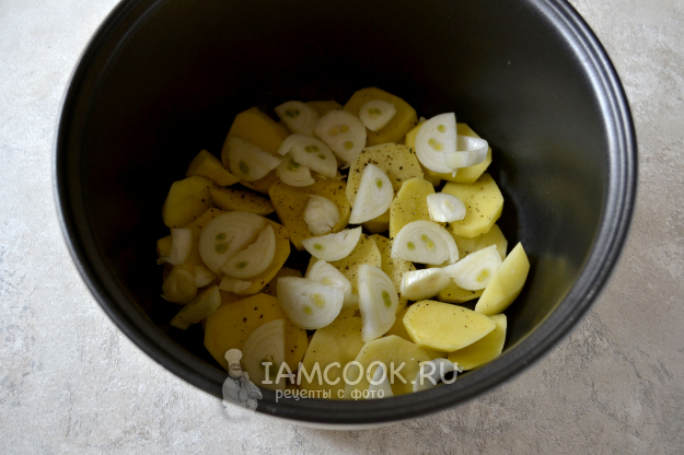 В чашу мультиварки положите картофель, посолите и поперчите.