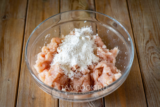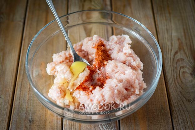 Куриный фарш выложим в миску, вобьем яйцо, добавим соль, перец. Перемешаем.