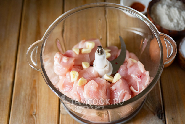 В чашу измельчителя выложим филе, нарезанное удобными для измельчения кусочками, добавим чеснок. Запустим устройство - в результате у нас должен получиться куриный фарш.