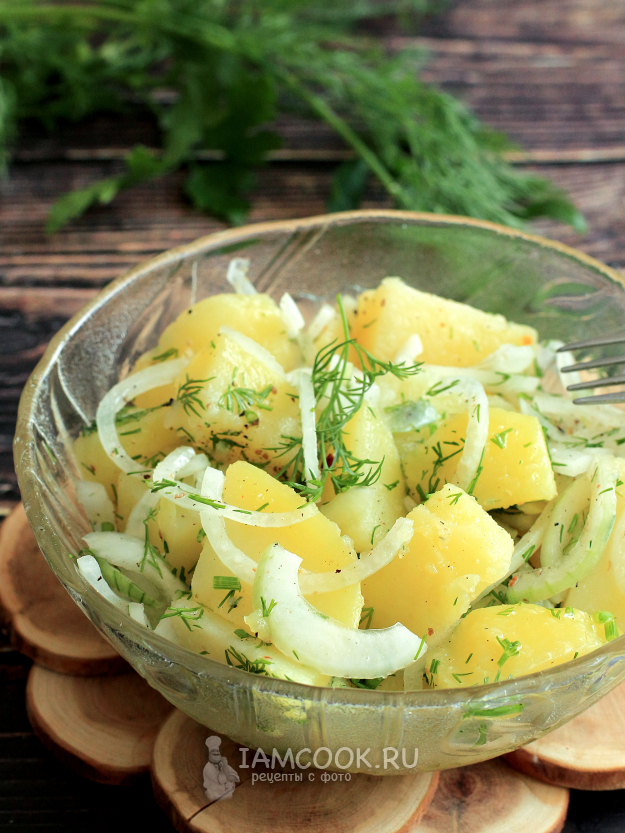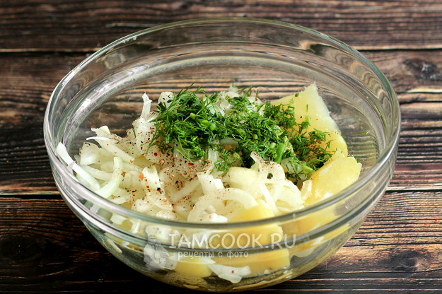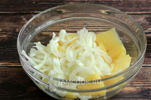 Затем жидкость с лука слейте и отправьте его к нарезанному картофелю.