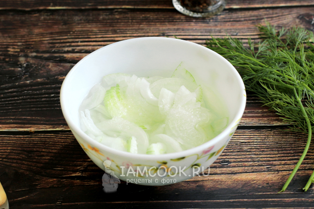 К нарезанному полукольцами луку добавьте щепотку соли, немного сахара, ложку уксуса и несколько ложек воды. Перемешайте и оставьте минут на 10-15, чтобы лук промариновался.