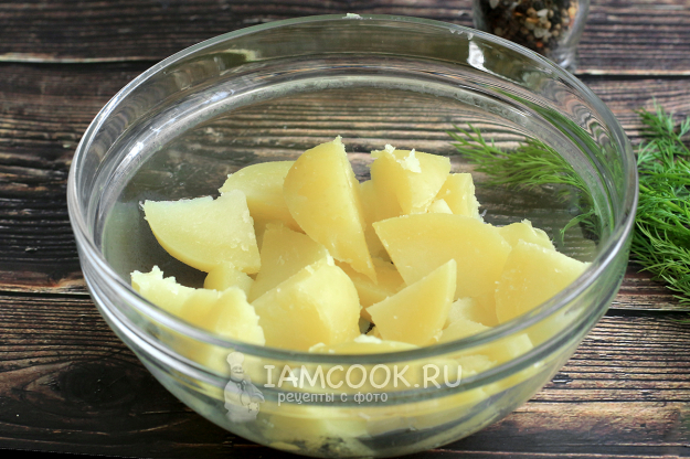 Отваренный картофель очистите от кожицы. Лучше, если он перед этим полежит хотя бы несколько часов в холодильнике. Хорошо охлажденный картофель чистится легко.